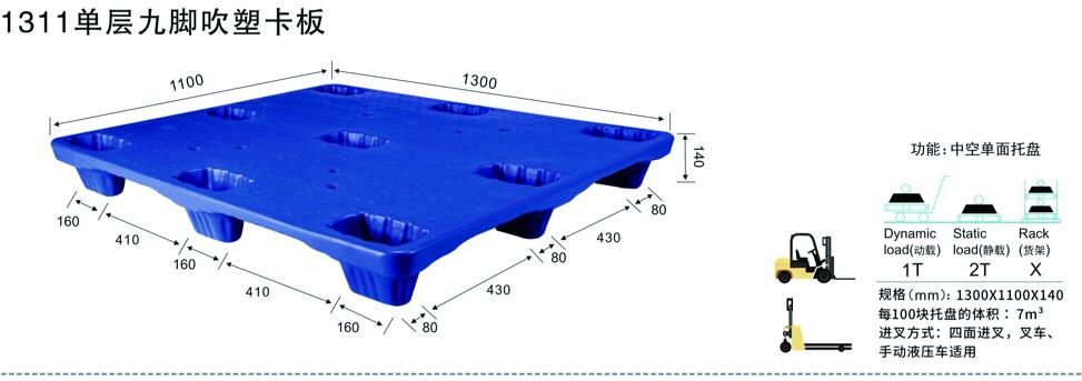 ● 吹塑托盤承載能力:靜載荷:6~7T;動載荷:1~2T;架空載荷:1~1.5T。